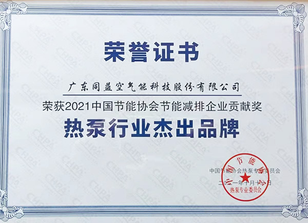 此次大會上,中國節(jié)能協(xié)會熱泵專委會特別舉辦了“2021年中國熱泵行業(yè)節(jié)能減排科技進(jìn)步獎(jiǎng)和節(jié)能減排貢獻(xiàn)獎(jiǎng)”表彰儀式。同益空氣能在一眾優(yōu)秀參選企業(yè)中脫穎而出,榮獲“中國熱泵行業(yè)杰出品牌”,這也是同益空氣能第七次蟬聯(lián)該項(xiàng)榮譽(yù),充分展現(xiàn)其作為行業(yè)品牌標(biāo)桿形象的魅力與底氣!