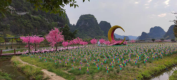 峰林曉鎮(zhèn),位于廣東清遠(yuǎn)英德市九龍鎮(zhèn),地處于英德市英西峰林核心段,是國家AAAA旅游景區(qū),也是中國美麗鄉(xiāng)村百佳范例。景區(qū)內(nèi)有上千座呈線型排列的石灰?guī)r質(zhì)山峰,山勢雄偉,大小溪澗、河流穿繞其間,景色奇特。千姿百態(tài)的山峰、神秘莫測的巖洞、嶙峋怪異的巖石、變化無窮的云海、霧景,勾勒出鄉(xiāng)土氣息濃郁的田園風(fēng)光景象。其間千畝花海爛漫盛開,風(fēng)光綺麗;碧水藍(lán)天共一色,神韻非凡。